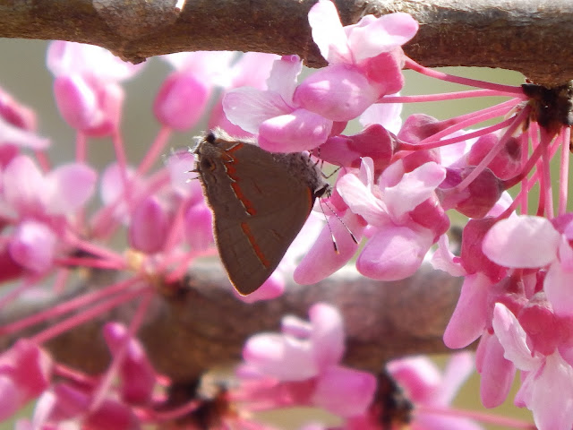 | Red-banded Hairstreak nectaring on Eastern Redbud at butterfly garden |